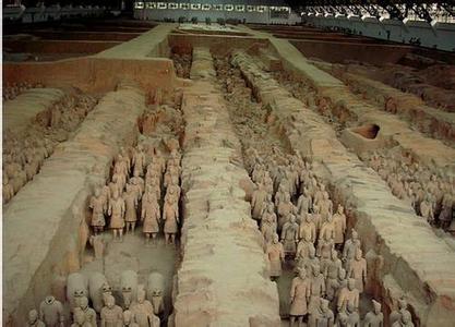 1974年春,當?shù)剞r(nóng)民打井,無意中挖出一個陶制武士頭,后經(jīng)有組織的發(fā)掘,終于發(fā)現(xiàn)了震驚世界的秦始皇陵兵馬俑。目前為止共發(fā)掘出三個坑, 其中一號俑坑是早發(fā)掘、面積大的一個坑。在一號坑左、右兩側(cè)又各有一個兵馬俑坑,現(xiàn)稱二號坑和三號坑。三個坑呈品字形排列,共占地達2萬多平方米,內(nèi)有和真人、真馬大小相似的陶俑、陶馬近8000件。有車兵、騎兵和步兵等不同的兵種,排列整齊有序。