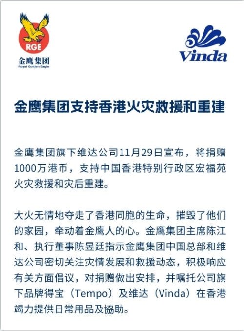 金鷹集團(tuán)支持香港火災(zāi)救援和重建